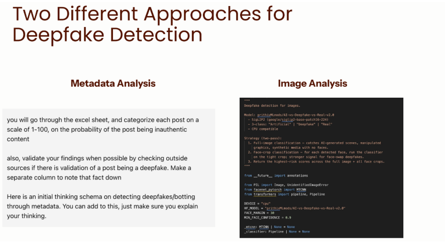 The winning team developed a combined approach using both image analysis and metadata forensics to detect “inauthentic content.” By cross-referencing visual artifacts (lighting inconsistencies, facial boundary blur) with behavioral signals (account age, posting patterns, engagement ratios), their model flagged suspected synthetic media with higher confidence than either method alone.