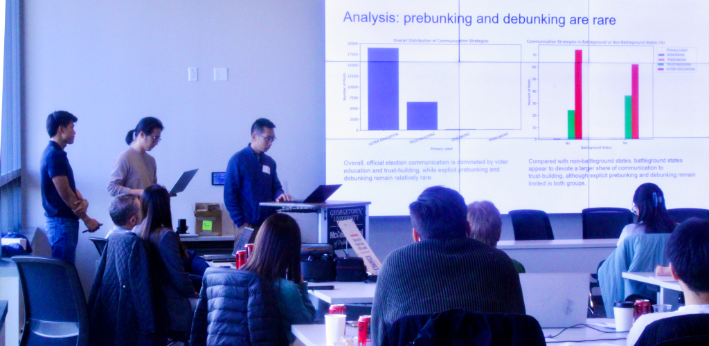 Faculty from Georgetown’s Massive Data Institute – Associate Teaching Professor Thessalia Merivaki, Assistant Research Professor Sejin Paik, Director Lisa Singh and Associate Research Professor Renée DiResta – sorted 45 students into nine teams (five deepfake, four counterspeech), deliberately mixing skill levels so that each team included students with strong data science backgrounds alongside those bringing policy, legal, or subject-matter expertise.
