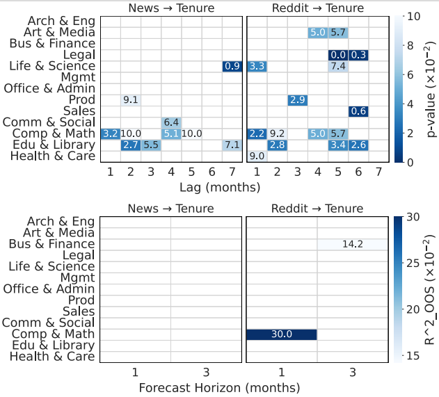 Knowledge-intensive fields react most strongly. Computer & Math, Arts & Media, Education, and Life & Social Science show the clearest predictive links between discourse intensity and subsequent employment changes.